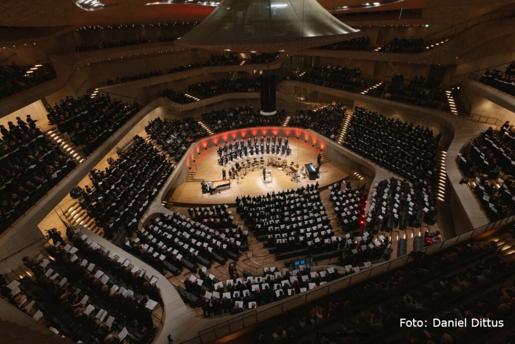 Singen macht glücklich! Singen schafft Harmonie. Musik verbindet. Das konnte man schon erleben bei den Proben zu diesem Konzert, die über das Wochenende verteilt in der Rolf-Liebermann-Halle des NDR, der Laeiszhalle und im Großen Saal der Elbphilharmonie stattgefunden hatten. Ungefähr 900 Sangesbegeisterte waren zum Teil von weit her angereist, um mit dem NDR Vokalensemble gemeinsam zu singen. Unterstützt wurden sie zeitweilig von Blechbläsern, Schlagzeug, Pauken, Piano und Orgel.